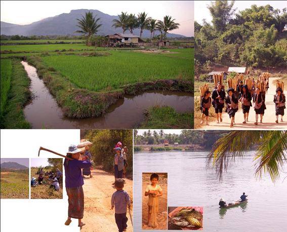 | AGRICULTURE – Le cycle du riz, le labourage, le repiquage en rizières, exemples de rizières de Luang Namtha à Champassak avec irrigation par pompage du Mékong, moissons, battages manuels, mécaniques et motorisés, séchage et pilage pour décorticage – Rives fertilisées du Mékong et des affluents – Réduction de l’abattis-brûlis – Diversification agricole, café, thé, soja et produits régionaux marchands – Noix de coco – FORÊTS – Bois de chauffage et de cuisine – Bois pour la construction et l’ameublement, exploitation et exportations sous contrôles gouvernementaux – Menaces malgré l’extension des zones protégées pour la biodiversité et les reboisements – Scènes avec éléphants – Evolution des forêts lao et diversification, arbres à débouchés économiques, arbres fruitiers, investissements pour l’hévéa – LE BAMBOU – LA PECHE - Diverses techniques, épervier, carrelets, pêches en rivière, pièges à poissons, étangs d’élevage, – L’ELEVAGE – en progression - LES ALGUES – de la récolte au sèchage – LE SEL – évolution de procédés de 2003 à 2010. | |
