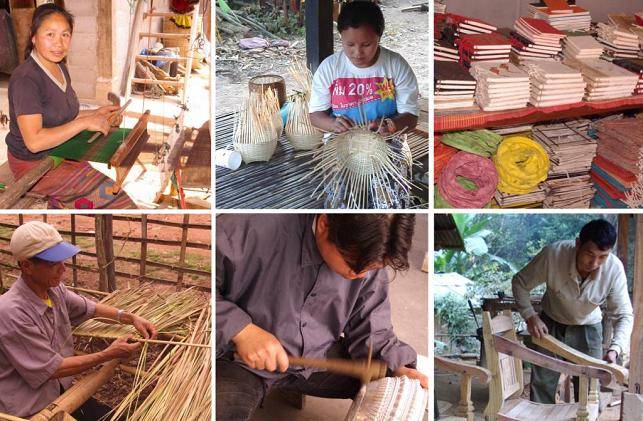 | TISSAGE – Métiers à tisser, variantes de la couture, broderie et point de croix, formations et transmission des savoirs, teinture et filage, scènes ethniques, le batik des Hmongs, la symbolique des motifs, marché aux tissus de Luang Prabang… TRANSFORMATION DU BAMBOU – VANNERIE – diversité des objets fabriqués – LE PAPIER – scènes de fabrication et variantes, approvisionnements de l’écorce de mûrier, évolution des débouchés et produits, le papier des Lanten, processus de fabrication – TOITURES ET CLOISONS TRADITIONNELLES – CHANTIERS NAVALS – MOBILIER – ORFEVRERIE – FORGERONS - LA SAISON DES BALAIS - portage des plantes à balais, préparation, ventes par colportage ou grossiste pour l’exportation – LE KAPOK – EVOLUTION DE L’ARTISANAT, avec l’évolution de la demande pour l’habitat et l’ameublement, avec l’outillage électrique | |
